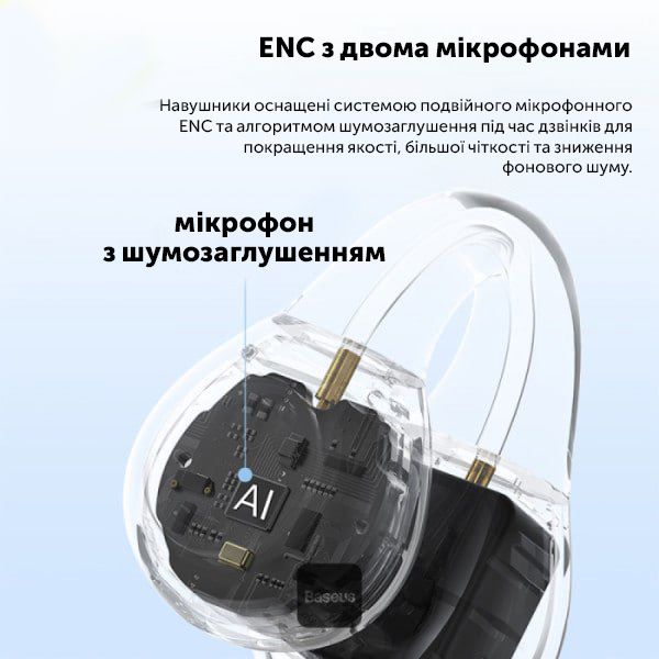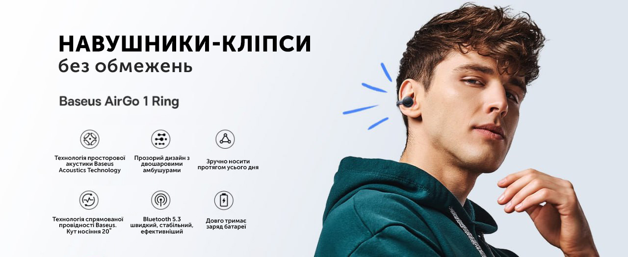 Конструкція Baseus AirGo 1 Ring Open-Ear унікальна — навушники не вставляються у вушний канал, а кріпляться зовні вуха за допомогою м’яких силіконових накладок і гнучкої рамки, яка охоплює верхню частину вуха. Легкий корпус із міцних матеріалів та прозорі заушини надають моделі мінімалістичного й сучасного вигляду. Така посадка зменшує навантаження та дозволяє забути, що навушники взагалі надягнуті.